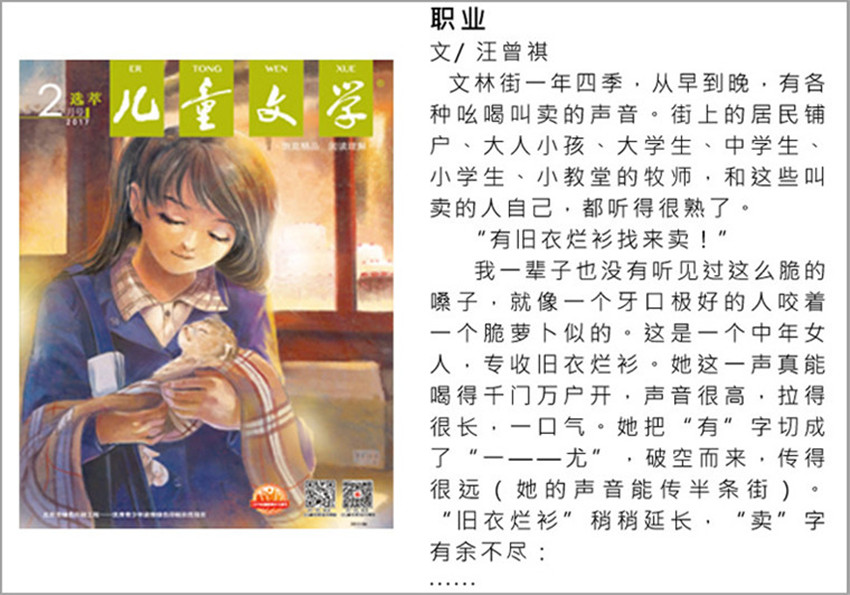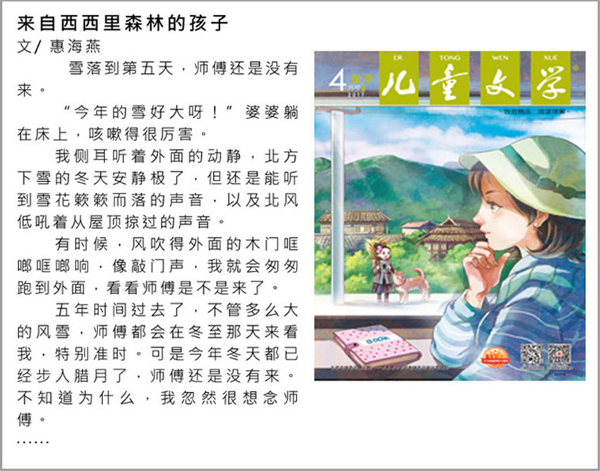 《兒童文學(xué)》工整、清晰的印刷,優(yōu)美的配圖,增加了孩子喜歡它,讀它的理由,文章將閱讀的趣味性與實(shí)用性完美相結(jié)合,在中外著名繪本與童話故事中寓教于樂(lè)。讓更多的孩子參與閱讀、寫作。